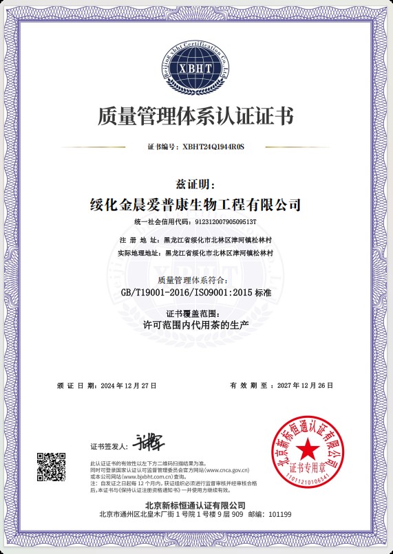 綏化金晨愛普康生物工程有限公司位于黑龍江省中南部地區(qū)的綏化市北林區(qū),所處位置東經(jīng)124度,北緯45度,位于松嫩平原的呼蘭河流域,“有寒地黑土,塞北江南”的美譽,是全國重要的商品糧基地,屬中溫帶大陸性季風氣候,四季分明,雨熱同期,冬季冰雪覆蓋,夏季降雨集中氣候溫熱濕潤。綏化金晨愛普康生物工程有限公司是一家專業(yè)從事健康養(yǎng)生產(chǎn)品研發(fā)、生產(chǎn)及銷售企業(yè),公司占地總面積8000平方米,建筑面積5000平方米,公司周圍無任何污染源,是食品生產(chǎn)基地。公司生產(chǎn)車間潔凈度級別達到10萬級,同時擁有數(shù)十臺先進的生產(chǎn)設備及高科技檢驗儀器,從產(chǎn)品的原輔料、中間品、成品到銷售的全過程嚴格把關,使生產(chǎn)中每道工序都符合產(chǎn)品的高標準要求,從而保證了公司生產(chǎn)的每一袋產(chǎn)品合格,無質量缺陷。綏化金晨愛普康生物工程有限公司率先采用了企業(yè)資源ERP管理系統(tǒng),肩負著養(yǎng)生產(chǎn)業(yè)的重要課題,同時又是江蘇省國家藥用植物重點實驗中心科研成果轉化的生產(chǎn)試驗基地,公司核心成員均為本科以上學歷。生產(chǎn)的產(chǎn)品有近五十個品種的代用茶產(chǎn)品,公司先后通過HALAL國際認證,編號為SSPY-201318-33849;ISO9001質量管理體系認證編號為XBH···
